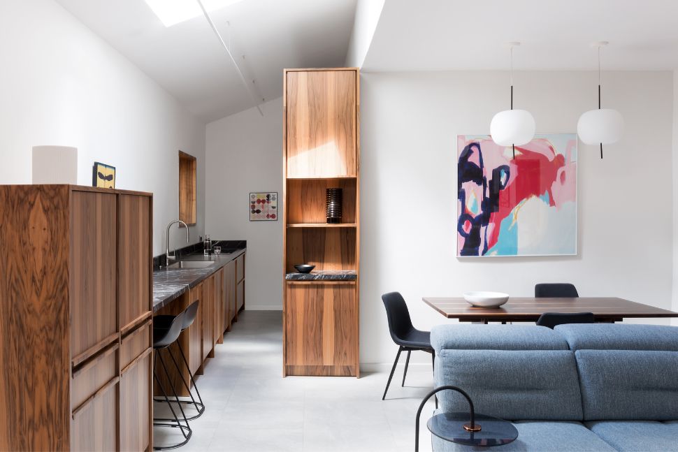 מטבח קטן בין שני קירות כשצבע הארון ממשיך על התקרה ובכך מגדיר את שטחו