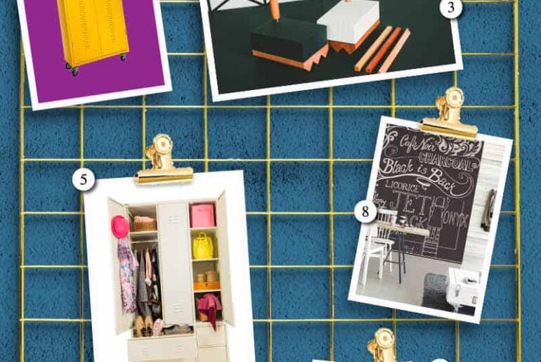 1 שרפרף של המותג UMBR הקנדי 999 שקלים | עיצוב: קרים ראשיד 2 מעצור לדלת בעיצוב שטרות | צילום: ניסן גאנט, 9.90 שקלים 3 סרגלים ומחדדים מבית Pulp ו4 איורים מקסימים לתליה על הקיר 5-6 הלוקרים של לה גרדיה 7 מנורת קקטוס מבית סלקט 15.90 8 טפט המשמש כלוח 26 שקלים למטר 9 קליפס לנשיאת כוסות של OroTranding
