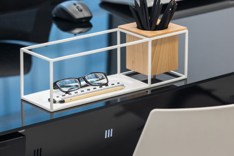 את שולחן העבודה יש לתכנן תוך חשיבה על פרמטרים פונקציונליים אך גם עיצוביים. בשני חדרי מנכ"ל נבחרו אביזרי ההלבשה כפועל יוצא של הצבע השולט בחדר ובשולחן עצמו. בחדר שבו שולט הצבע השחור עם ספרייה שחורה ושולחן עבודה שעליו פלטת זכוכית שקופה, הונח מתקן עפרונות לבן של SOHO. מעבר להיותו פריט שימושי וחיוני לכל שולחן עבודה, הוא נבחר הודות לצבע הלבן שלו, הבולט על הרקע השחור השולט בחדר.