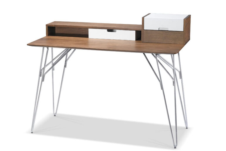 שולחן עבודה בגוון אגוז עם מגירות לבנות ורגלי מתכת, להשיג ברשת IDdesign צילום: ישראל כהן