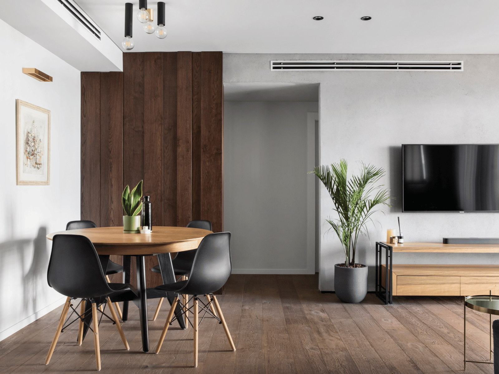 עם סיום משימת החלפת הקיר במחיצה שקופה, המעצבת השלימה את עיצוב הבית באמצעות חיפוי הרצפה בפרקט, הנמכת תקרות בהן שולבה תאורה, עבודות נגרות מעניינות, הוספת צבע, חיפוי קירות וכמובן העמדת הרהיטים וסטיילינג.