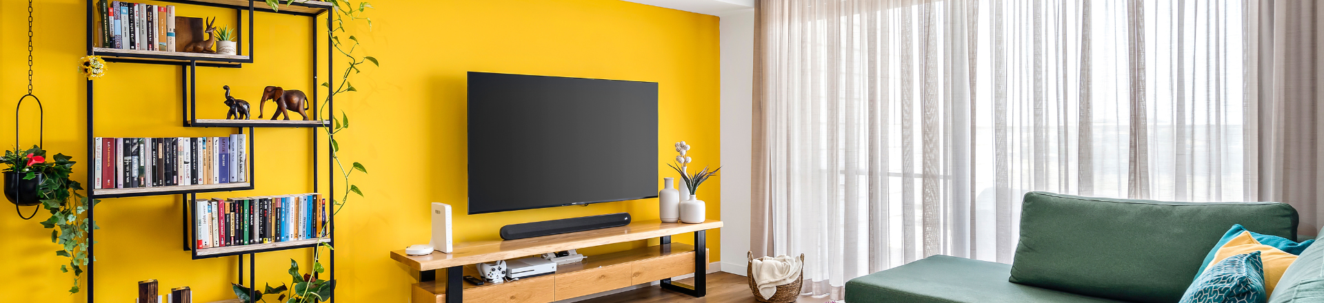 לקיר הכוח בסלון, בלי הרבה התלבטויות, נבחר צבע צהוב זוהר ומאיר כמו קרני שמש. וכמו שהשמש משפיעה על הצבע בטבע, כך הקיר הצהוב מתכתב עם צבעוניות הרהיטים שנבחרו לעיצוב הסלון בגוונים של פריחה אביבית, ספה ירוקה, כורסא טורקיז וכריות פרחוניות. להדגשת הקיר הצהוב נבחרה ספרייה גאומטרית שחורה, בה שולבו עציצים עם צמחים טבעיים.