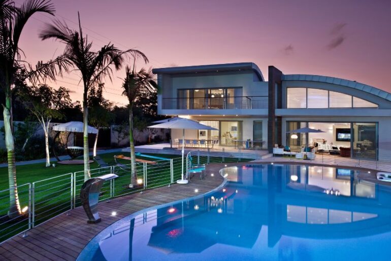 עם העלייה ההדרגתית ממפלס הרחוב מתגלה חזית מרשימה שבה מתקיים שילוב מעניין וקונטרסטי בין הגג המעוגל לקיר האבן הישר. זהו החלק הרציני והמרשים של הבית, הסוחף קריאות התפעלות מהעוברים ושבים. הקו האדריכלי המדוקדק שמאפיין את חזית הבית משתנה מיד עם הכניסה אליו, בעת שנתקלים במראה ענקית הנשענת על קיר צר ומאחוריה מסתתרים שירותי אורחים בסגנון ויקטוריאני אריסטוקרטי. "בהתחלה חשבנו להציב ויטרינה ארוכה לאורך כל החלל, כך שמי שנכנס יוכל מיד לצפות בקנטרי קלאב שיצרנו בחצר האחורית, אבל הצורך בשירותי אורחים בקומת הכניסה קצת הסיט אותנו מהכיוון הזה. והכול לטובה. כך סודו וקסמו של הבית אינם מתגלים מיד עם הכניסה וההפתעה מגיעה בשלבים", אומר בחיוך האדריכל שגיא מורשטיין.