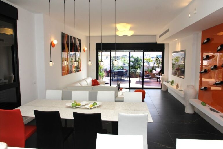 בבניין מגורים שנכלל בפרויקט שיפוצים עירוני תמ"א 38, מעורבותה של האדריכלית מיכל יפתח רותם החלה עוד בטרם נרכשה הדירה. בתכנון דירת הגג מחדש, שהפכה בתום השיפוץ לפנטהאוז מרווח, בוצעה חלוקה מחדש לחדרים. על מנת שהעיצוב יהיה מושלם, לכל מערכות התפעול כגון: מיזוג אוויר, מערכות שמע ותאורה תוכננו מסתורים סמויים חלקם מעוצבים בקו אפס. האלמנט הבולט ביותר שנבחר כמוביל את קו העיצוב הוא קיר יין כתום, שהושפע מהגידים הכתומים השזורים באריחי גרניט פורצלן שחורים, שנבחרו לרצפת כל הדירה.
