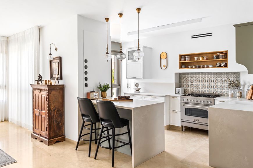 אם מכול סיבה שהיא החלטתם לוותר על פינת אוכל, זה לא אומר שוויתרם על אווירה פסטורלית בזמן שאתם סועדים. שימו לב לכל הפרטים הקטנים שבונים את השלם הכפרי. רצפת פרקט של לוחות מאורכים, גוונים בהירים, גופי תאורה נוסטלגיים, ספה מחבקת, אי גדול עם משטח עליון עץ, כמובן, וכסאות עץ כמו פעם. בבקשה, הנה לכם מרחב לבילוי ואירוח שכולו מדבר כפריות.