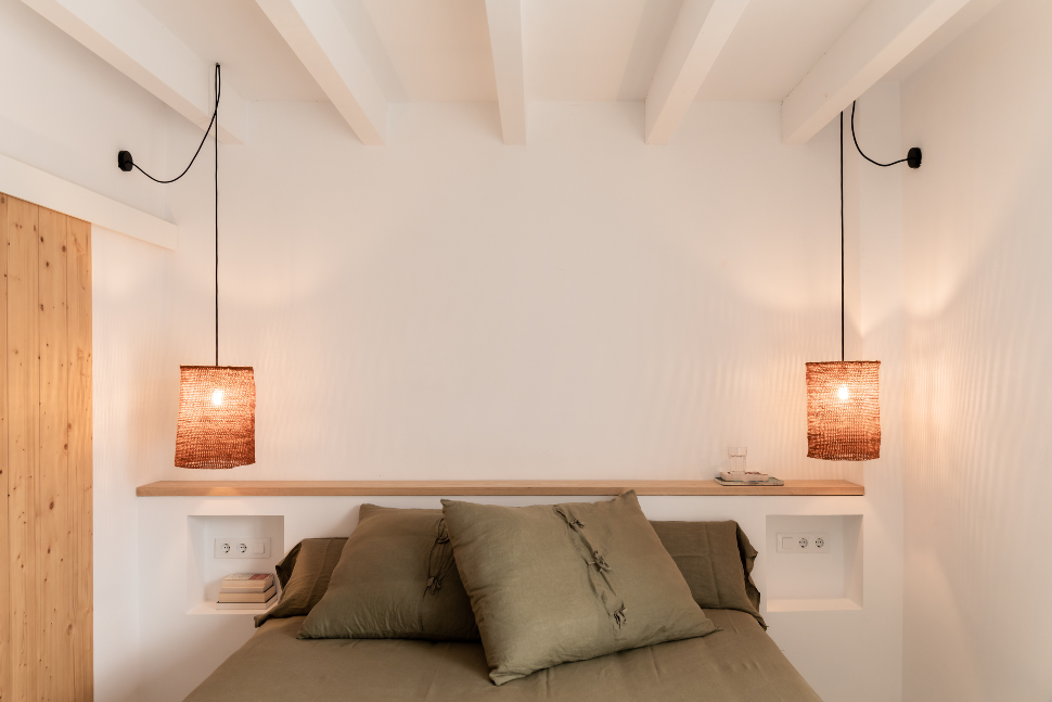 שני גופי תאורה אורגניים בחדר שינה מעוצב בפשטות